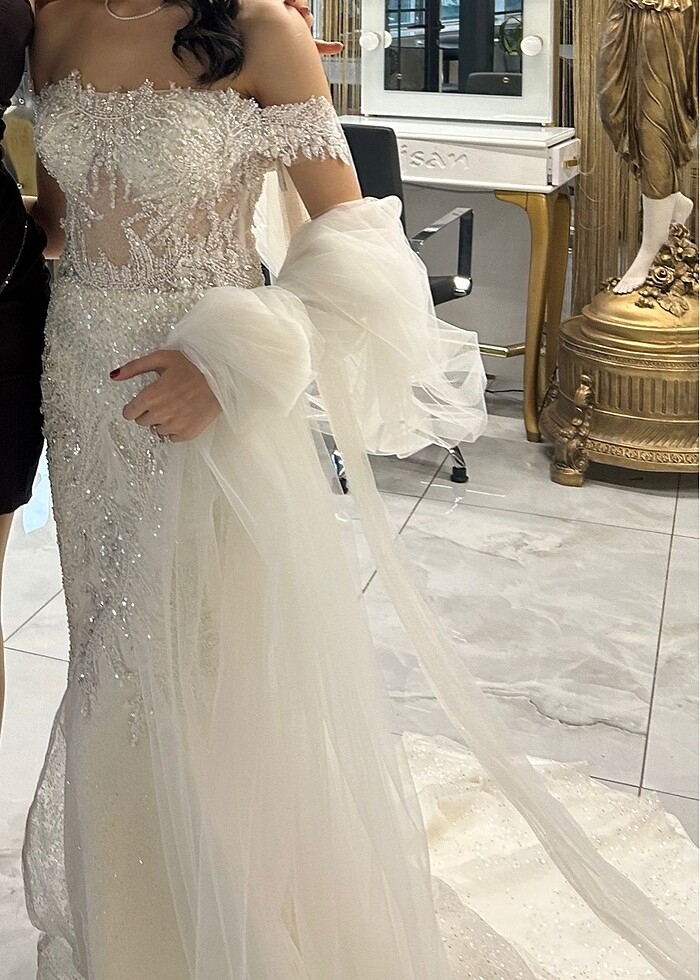164 cm boyum, 48kg, 9cm topuklu ile giyildi. Arkasında fermuar bulunuyor. Taşlı işlemeli gelinlik.