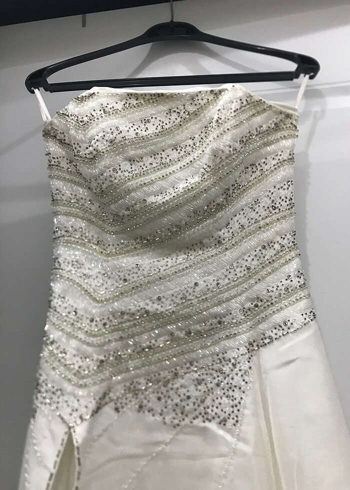 Straplez taş detaylı gelinlik iki adet eldiveni mevcut alan kişi sadece kuru temizlemesini büyüt üstünü yapıp giyebilir hiçbir sorunu yok