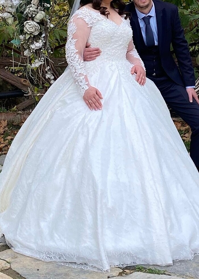 Bir gece giyildi. 44-46-48 beden uyumlu. Bursa Gümüşler Mağazasından satın alındı. Arkası ipli bedeninize göre ayarlaya bilirsiniz. Duvağı ile gönderim sağlanacak satılık ürün kiralık değildir.