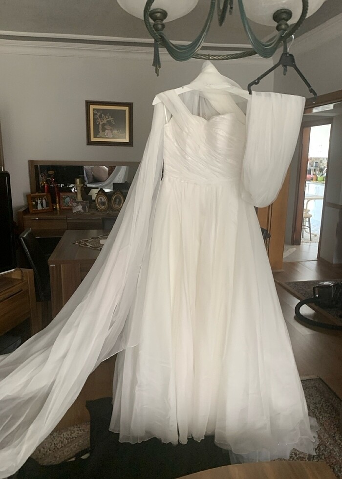 Kızımın gelinliği sadece üç saat giydi özel dikim 2023 model ipek tül ve ipek satenden Akay gelinlikte dikildi Beden yazmıyor vücut ölçüsüne göre