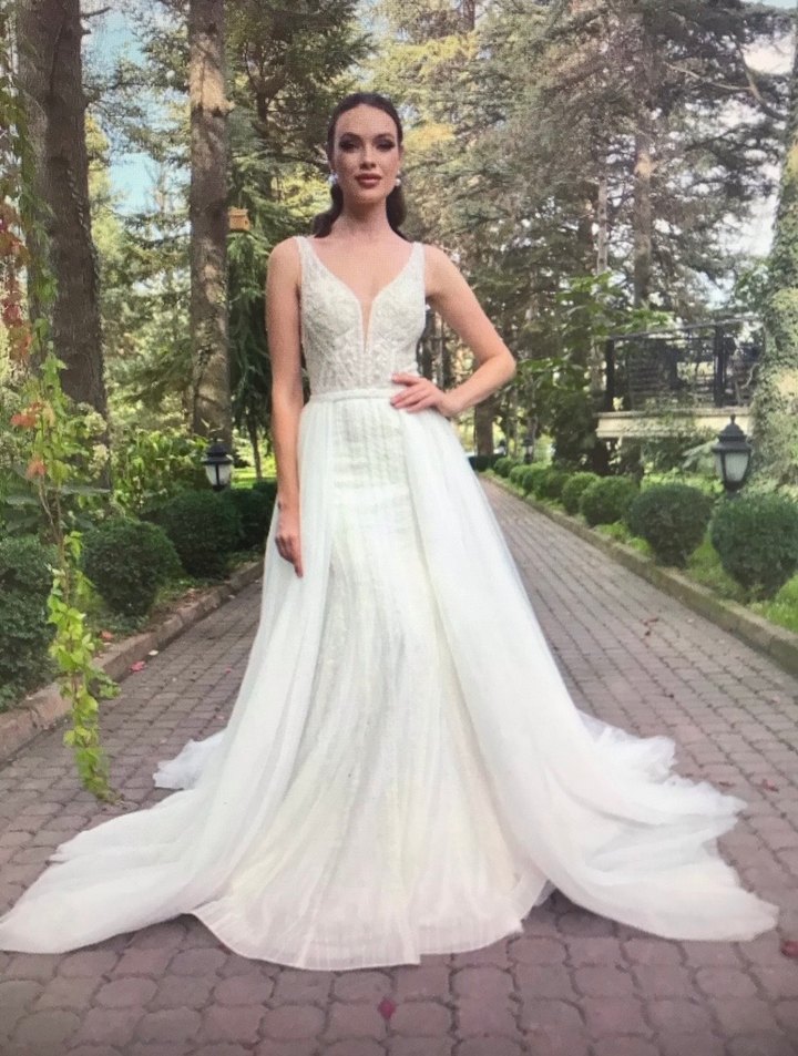 Aysira marka balık gelinlik. Üzerinde minik minik boncuk taşları var. Tütüsü yok sadece iç kısmı mevcut. S bedene uygun fakat içinde biraz esneme payı vardır.