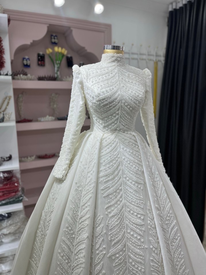 Beyaz renkli, yüksek yakalı ve uzun kollu bu prenses gelinlik, düzenli kesimi ve uzun boyuyla klasik ve gösterişli bir şıklık sunar. Detaylı boncuk işlemeleriyle süslenmiştir.