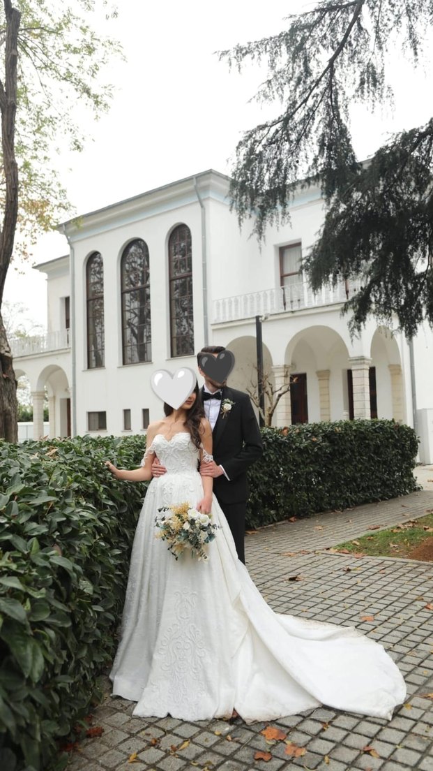 Tasarım taşlı gelinlik, korse kısmında ve etek kısımları dantel ve bol taş işlemesi var ince askılı koldur ben dış çekimde düşük kol kullanmayı ve tarlatansız tercih ettim. Ayrıdan uzun duvak ucunda da taş işlemeleri mevcut, arkası fermuarlı ve ip bağcıklı 36-38 bedene uygun olur. Tarlatanı kırıldığı için mevcut değil. Dış çekimde kullandığım incili saç aksesuarı hediye ediyorum. Alana uğur getirsin