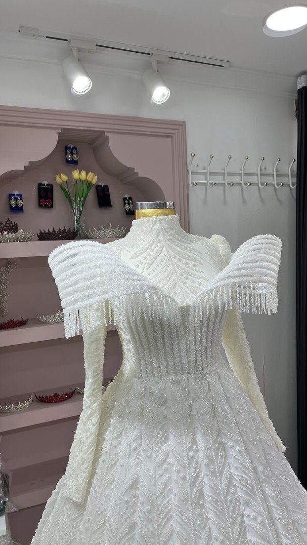 İnce boncuk işlemeli yüksek yakalı, uzun etekli prenses model gelinlik. Kolları yapılı, bohem tarzda şık ve göz alıcı tasarım.
