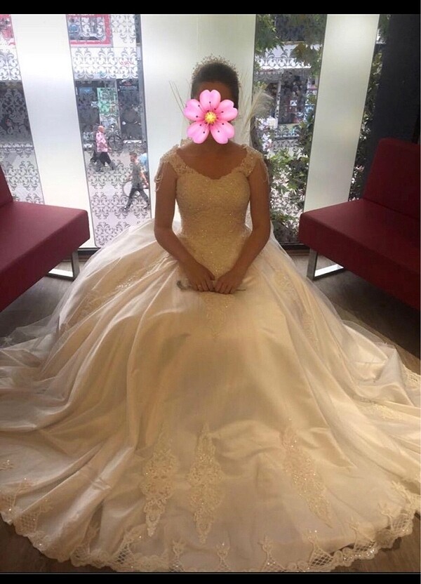 Saray Gelinlikten alındı 40 bedendir 38 bedenede uyar arka kısmı düğmeli üzeri iplidir.gelinlik 2-3 saat giyilmiştir temiz ve herhangi bir deformesi yoktur kumaşı saten üzerine ince bir tüldendir o yüzden çok şık duruyor A kesimdir kollarında boncuklardan asimetrik askılar mevcut duvağı ve tarlatanı içinde mevcuttur boyum 1.65 kilom 60 dı ozamanlar giydiğim topuk boyu yaklaşık 10 cm kadardı tarlatanı ayrıdır
