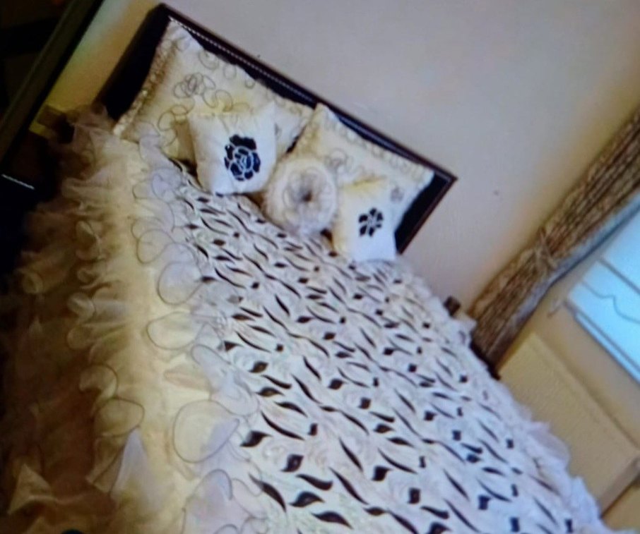 Siyah beyaz pul nakışlı fırfırlı gelinlik model. Hiçbir sıkıntısı yoktur resimde göründüğü gibi toplam 5 adet yastık ve örtüden oluşmaktadır