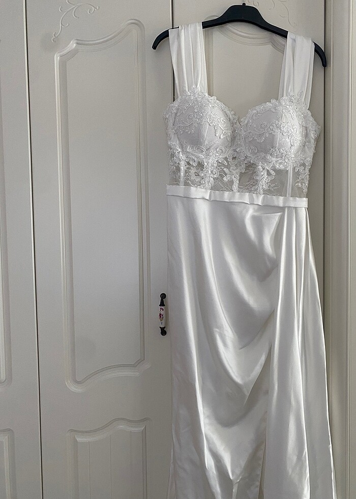 Bir kez fotoğraf çekiminde kullanıldı.arkası britlidir.1.55 boy 63 kg de kullandım.mini astarı var içinde.kuru temizlemesi yapılmış42-44 beden uyumlu.koltuk altından itibaren boy uzunluğu 1.25 cm