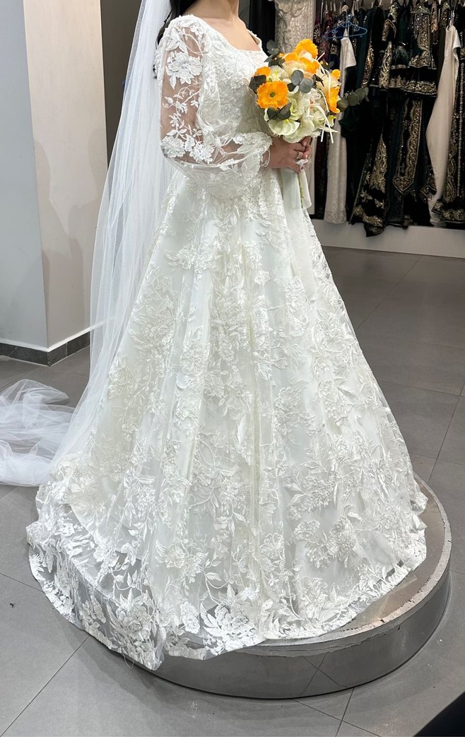 Ürünü düğünümde giydim :) Kuru temizleme yapıldı. 34 beden ile uyumludur. Boyum 155 cm, 16 cm topuklu ayakkabı ile giyildi. Fotoğrafta belli olmuyor ama dantellerde hafif ışıltılar var. Akşam ışıkların altında minik minik ışıldıyor. En düşük kademe tarlatan ile kullandım. Alıcısına gelinlik ile birlikte gönderim yapacağım. Dilerseniz tarlatanlı kullanabilirsiniz.