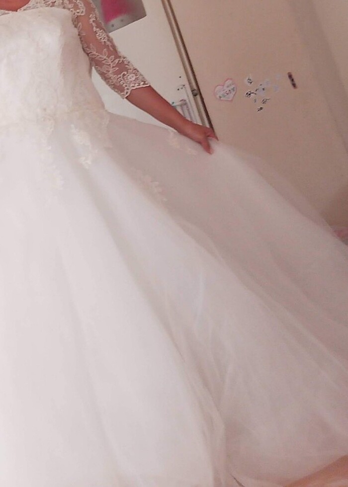 Gelinlik sadece düğünde bir kez giyildi.Yeni Gibi.Fransız korseli sırttan iple bağlamalı,L,XL bedene ayarlanabilir.Tülü hayal tül.belden üstü büyük kalpli desen güpür tül.