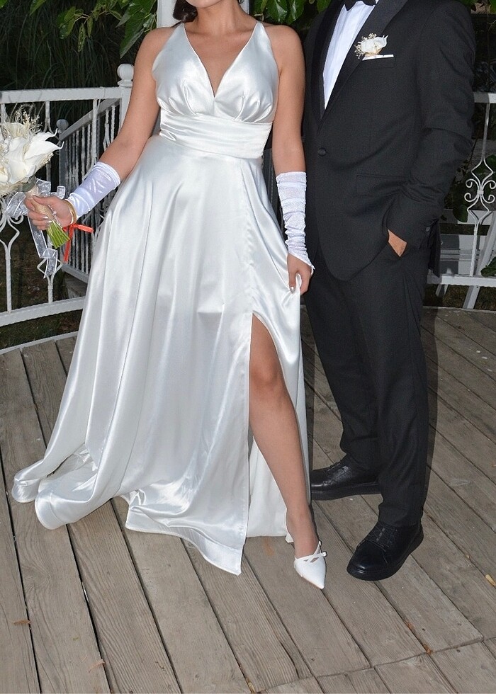 Ürünün hiç bir deformesi yoktur fakat kuru temizlemeye vermekte fayda var. Sadece düğünde 3 saat giydim içi astarlıdır yırtmaçlıdır. Sırt dekolteli ipli detaylıdır. Eldiven yanında hediye olarak göndereceğim 2 çeşit saten eldiven var isteğe göre göndereceğim bedeni M-L olarak aldım ipleriyle belini ayarlayabilirsiniz
