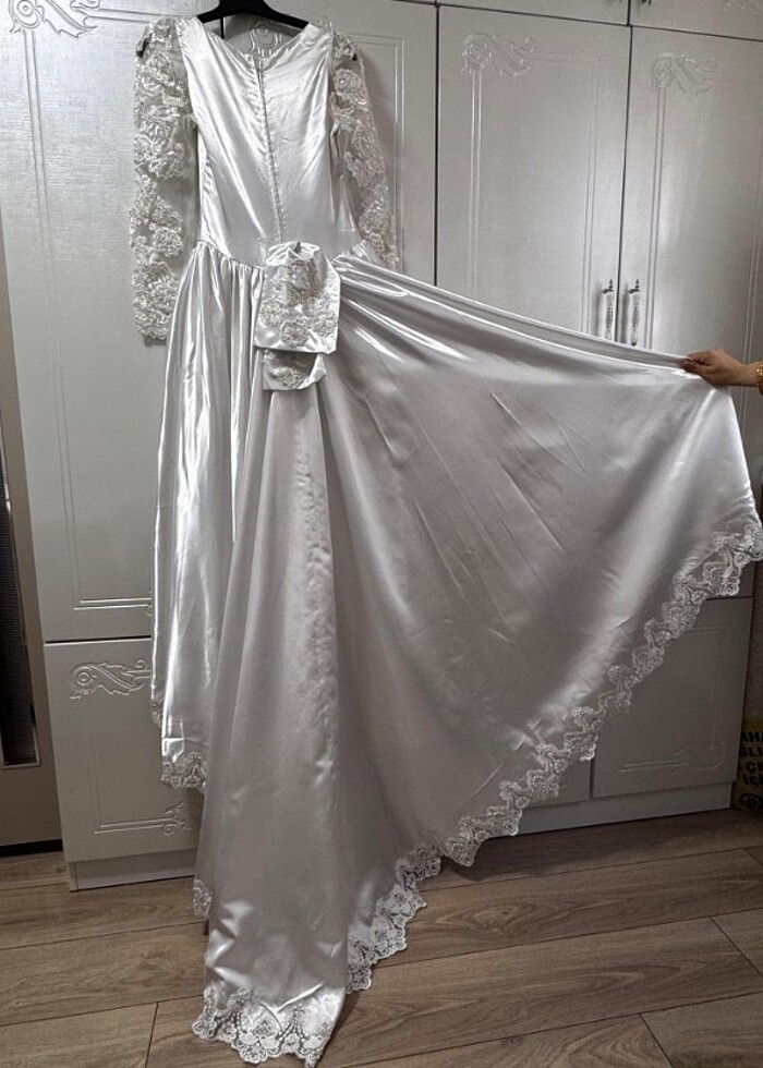 Gelinlik saten kumaş kollar dantel arkası uzun
