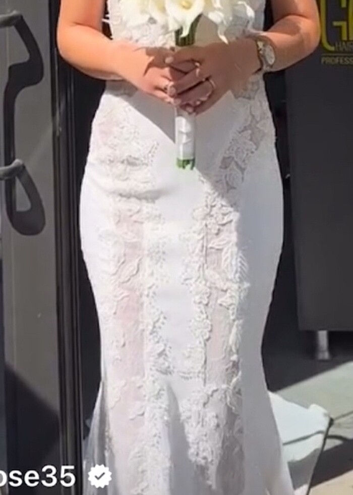 Tasarım balık gelinliktir. Yarı tarnasparandır bazı kısımları. Pamuklu saten ve dantel dizaynı vardır . Uzun kuyrukludur. Sadece nikahta giyildi. Alan kişiye kuru temizleme yapılıp gönderilecektir