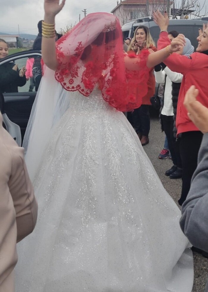 Gelinlik 1 sene önce alındı 42 numara arkası ipli kasnaklı simli duak ve tacıda vericem duak uzundur kabarıktır ve gelinlik spor ayakkabıda ücretsiz vericem taşlı modeldir 38 numara gelinliği duak ve tacla birlikte 15 bin aldım ben 10 bine vericem abiyede 2 milyara vericem 42 beden uyumlu üstü kırmızı boncuklu altı siyah yırtmaçlı askılı fermuarli kuru temizleme yapılmadı