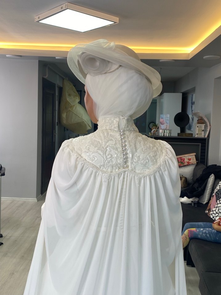 Pelerinli nostaljik boncukları ile sade şık tarz bir gelinlik