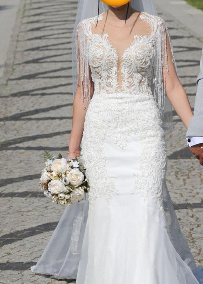 Bijoux marka tasarım gelinlik Boy 165-170 Kilo 50 Beden S Gelinlik alana 2 adet nişan elbisesi 2 adet takım elbise hediye. Takım elbise beden 48 Pembe elbisede standart