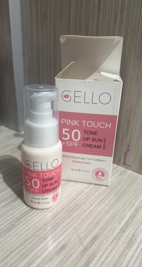 Gello Pink Touch SPF 50 güneş kremi, pembemsi ton eşitleyici etkisiyle cildi güneşten korur. 50 ml pompalı şişede sunulur. ☀️