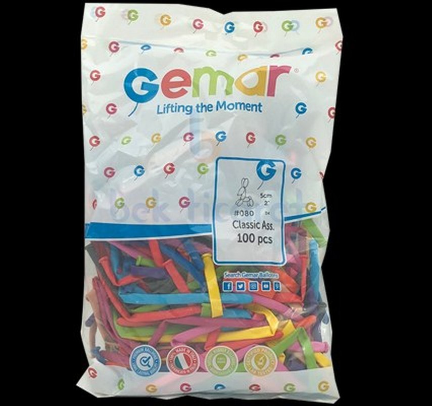 Gemar markasına ait, yaklaşık 5 cm boyutunda, 100 adet renkli balon içeren pakettir.
