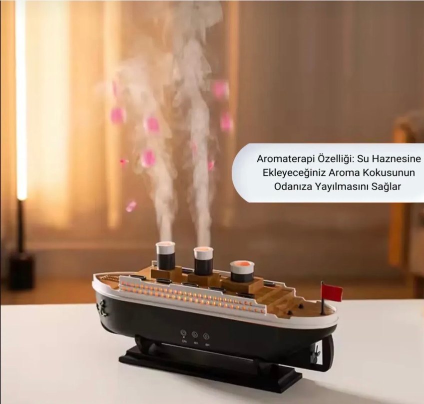7 Renkli LED Aydınlatma Ortamınıza uygun ruh halini seçin: gece lambası olarak da kullanabilirsiniz Zamanlayıcı Fonksiyonu 4 - 8 saat arasında ayarlanabilir otomatik kapanma özelliği Geniş Su Tankı (250 ML) Kesintisiz nemlendirme için ideal kapasite Ultra Sessiz Çalışma (30 dB) Gece uykusunda ya da odaklanmanız gereken anlarda bile rahatsız etmez Buhar Çıkışı: 15-30 ML/Saat Hızlı ve etkili nemlendirme Kompakt Boyutlar:30 x 7.1 x 14 cm Hafif Tasarım:Sadece 420 gram * 1 x Titanic Aromaterapi Hava Nemlendirici * 1 x Uzaktan Kumanda * 1 x Güç Adaptörü * 1 x Türkçe Kullanım Kılavuzu Lüks Seyir Gemisi Tasarımı, Yenilik ve Sanat Birleşimi: Bu elektrikli aroma difüzörü ve nemlendirici, okyanus astarlarından ilham alan benzersiz bir seyir gemisi tasarımına sahiptir.