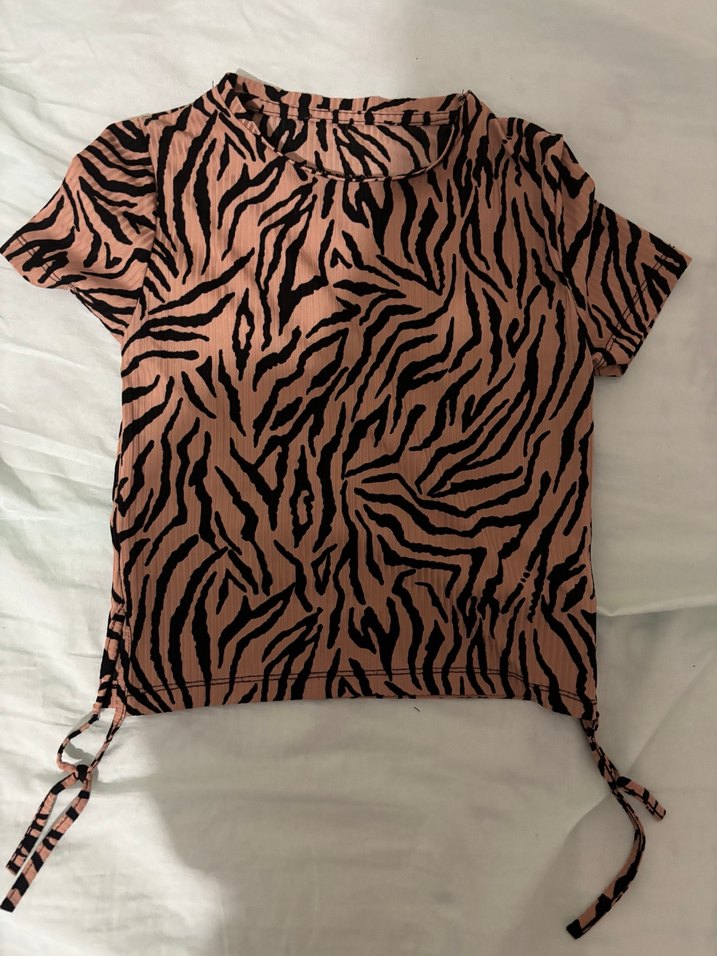 HİÇ BİR KUSURU YOKTUR S-M-L bedenlerine uygundur.Kahverengi zebra desenli, kısa kollu ve yüksek yakalı genc kız yada çocuk bluzudur. Pilili detaylar ve yan bağcıklar bulunur, yumuşak sentetik kumaştandır.