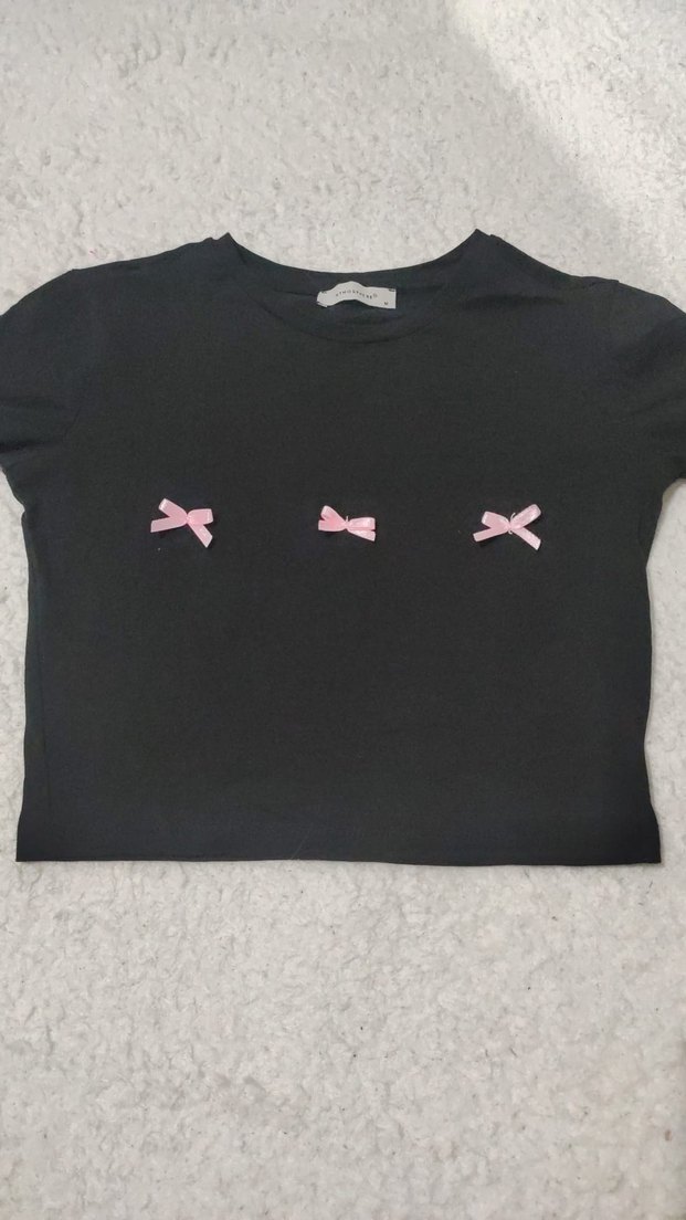 Kısa kollu, bisiklet yaka ve önünde üç pembe fiyonk bulunan, fitted kesim genc kız tişörtü. Koyu renk sentetik kumaştan, baskılı desenli, sokak stiline uygun.