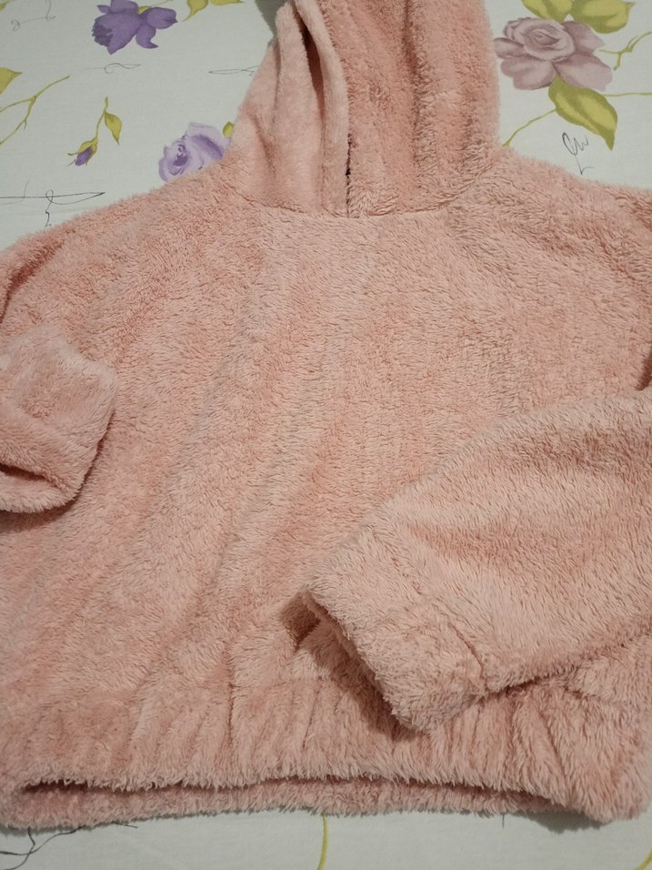 Kız çocukları için yumuşak ve sıcak kumaştan yapılmış, kapüşonlu pudra pembesi üst Desensiz sade tasarıma sahiptir.