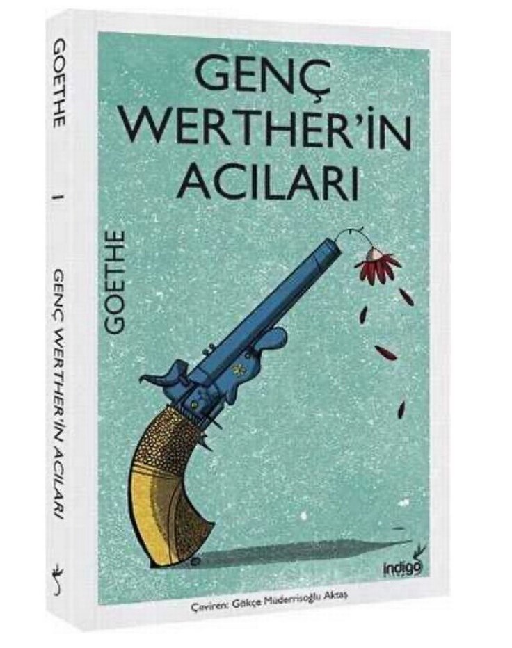 Goethe'nin klasik romanı "Genç Werther'in Acıları" indigo yayınevinin baskısıdır. Kapakta eski tarz bir tabanca ve düşen çiçek resmi bulunur.
