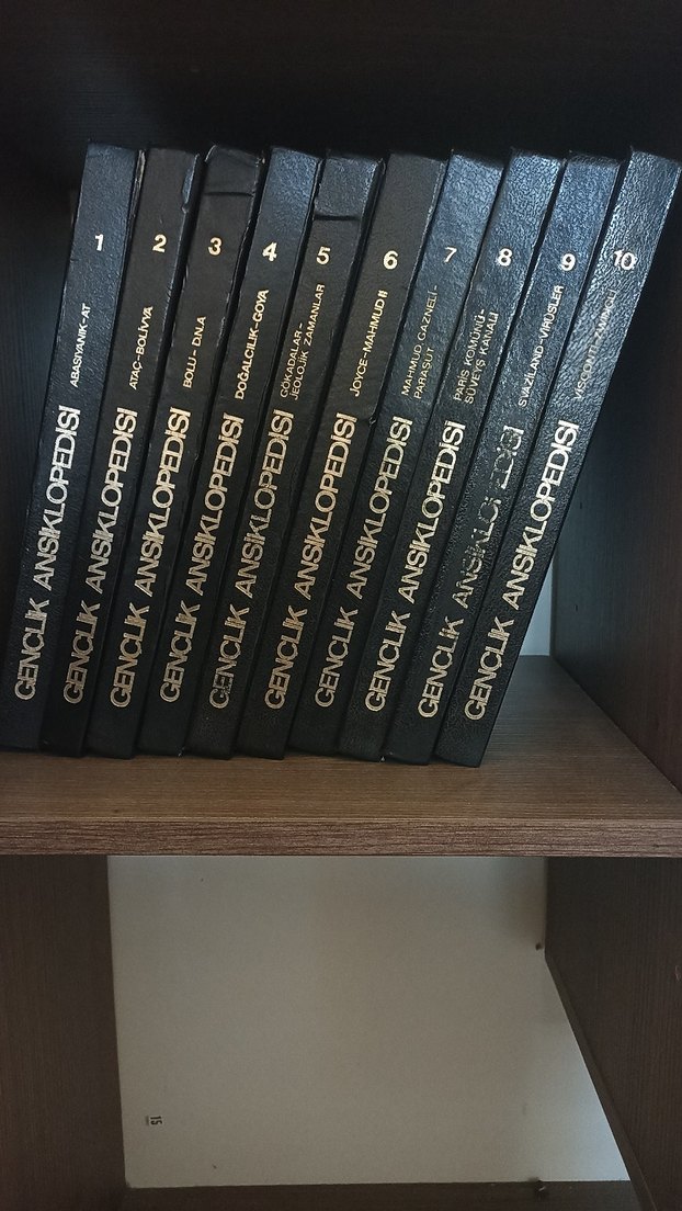 Gençlik Ansiklopedisi'nin 10 ciltlik tam seti, farklı konular ve yazarlarla raf üzerinde düzenli şekilde yer alıyor. 1980 basımı