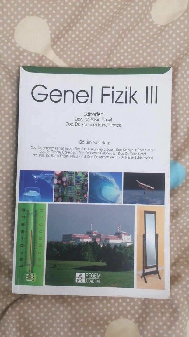 Genel Fizik III, editörler Doç. Dr. Yasin Ünsal ve Doç. Dr. Şebnem Kandil İnegç tarafından hazırlanmış, çeşitli yazarların katkılarıyla oluşturulmuş bir kitaptır. İçinde yazı ve işaretlemeler mevcuttur.