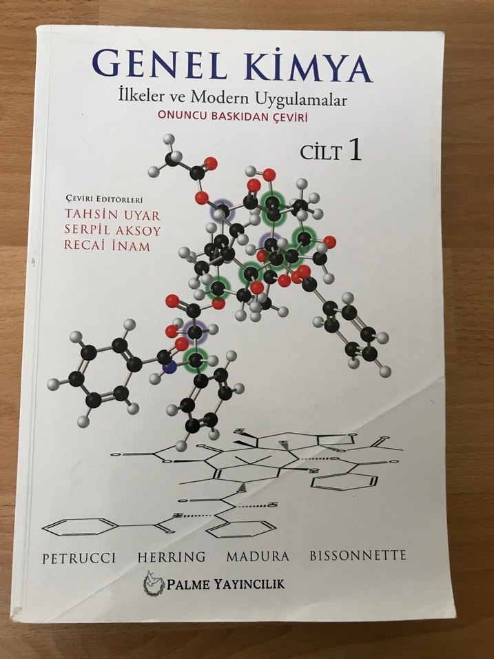 Genel Kimya ilkeler ve modern uygulamaları içeren, onuncu baskıdan çeviri birinci cilt kitabı. Editörler: Tahsin Uyar, Serpil Aksoy, Recai İnâm. İlk iki sayfası not alınmış gerisi temiz kitap . Sıfır denilebilir .