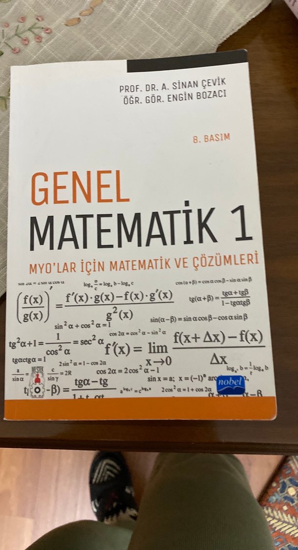 Prof. Dr. A. Sinan Çevik ve Öğr. Gör. Engin Bozacı'nın 8. basım Genel Matematik 1 kitabı, MYO öğrencileri için matematik formülleri ve çözümlerini içerir.