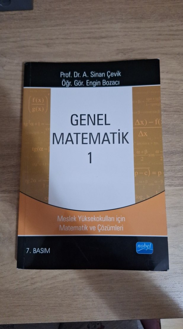 Prof. Dr. A. Sinan Çevik ve Öğr. Gör. Engin Bozacı'nın 7. basım Genel Matematik 1 kitabı, meslek yüksekokulları için matematik ve çözümler sunar.