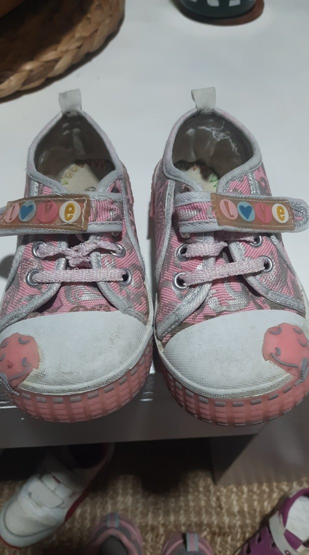 Pembe bağcıksız kız çocuk spor ayakkabısı, renkli batik desenli ve cırt cırtlı. Kauçuk tabanlı, kalp detaylı, günlük kullanım için uygun.
