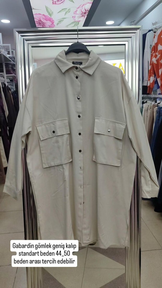Bej gabardin gömlek, düğmeli ön, uzun kollu ve geniş kalıp ile notched lapel yaka sunar. Günlük kullanıma uygun midi uzunlukta rahat bir modeldir. büyük beden ve geniş giyim için harika önü açıp içine badi ile de giyebilirsiniz ürünlerimiz mağaza ürünüdür ins:tayyibe_giyim
