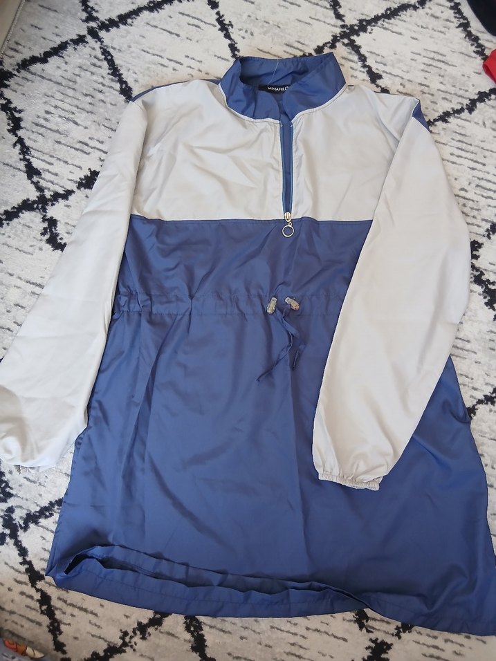 Gevşek kesim, yüksek yakalı ve uzun kollu fermuarlı ön ve ayarlanabilir bel özelliğine sahiptir. Mavi ve gri renklerde, sentetik kumaştan üretilmiştir. 46 48 beden aralığına olacak kadın haşema sudan çıkar çıkmaz süzülüp kuruyor