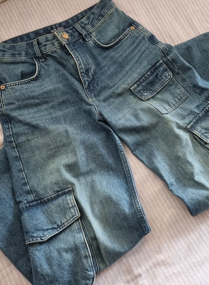 Geniş kesim, yan cepli kadın mavi kot pantolon, günlük kullanım için rahat ve şık bir görünüm sunar. paça kısmında hafif defosu var içe katlanıp kullanılabilir. cok az giydim rengi cok guzel boyu uzun