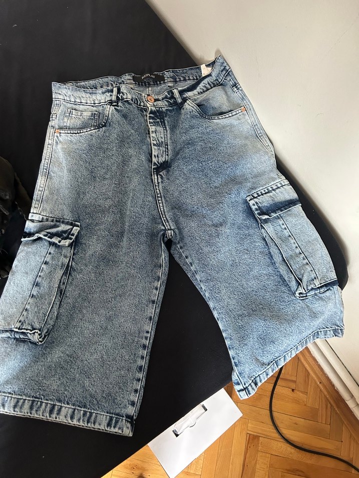 Bu erkek kot şortları, geniş kesim ve kemerli beliyle mavi-gri tonlarda, sokak tarzı için cepli tasarıma sahiptir. Günlük kullanıma uygundur.