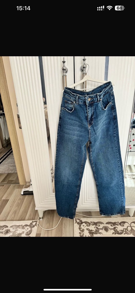 Mavi denim kot pantolon, geniş kesim ve tokalı detaylarla günlük kullanıma uygun sade normcore tarzda midi boyda.