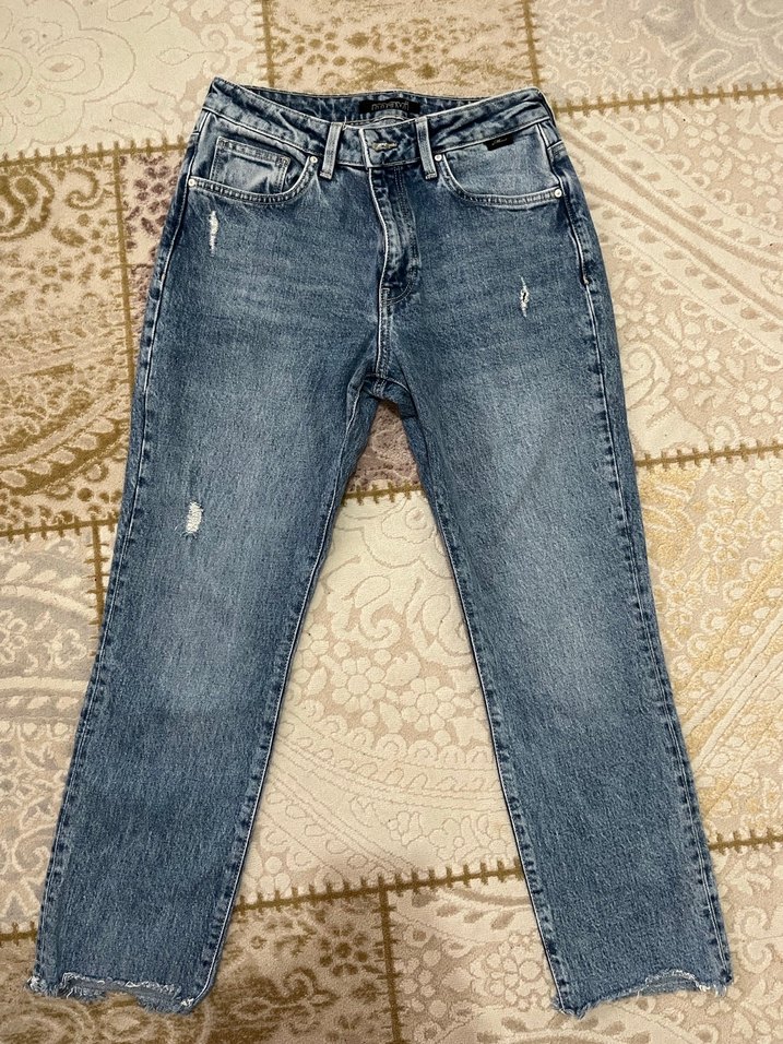 Geniş kesim, mavi kot pantolon, tokalı detaylı ve midi boyda. Günlük rahat kullanıma uygundur.