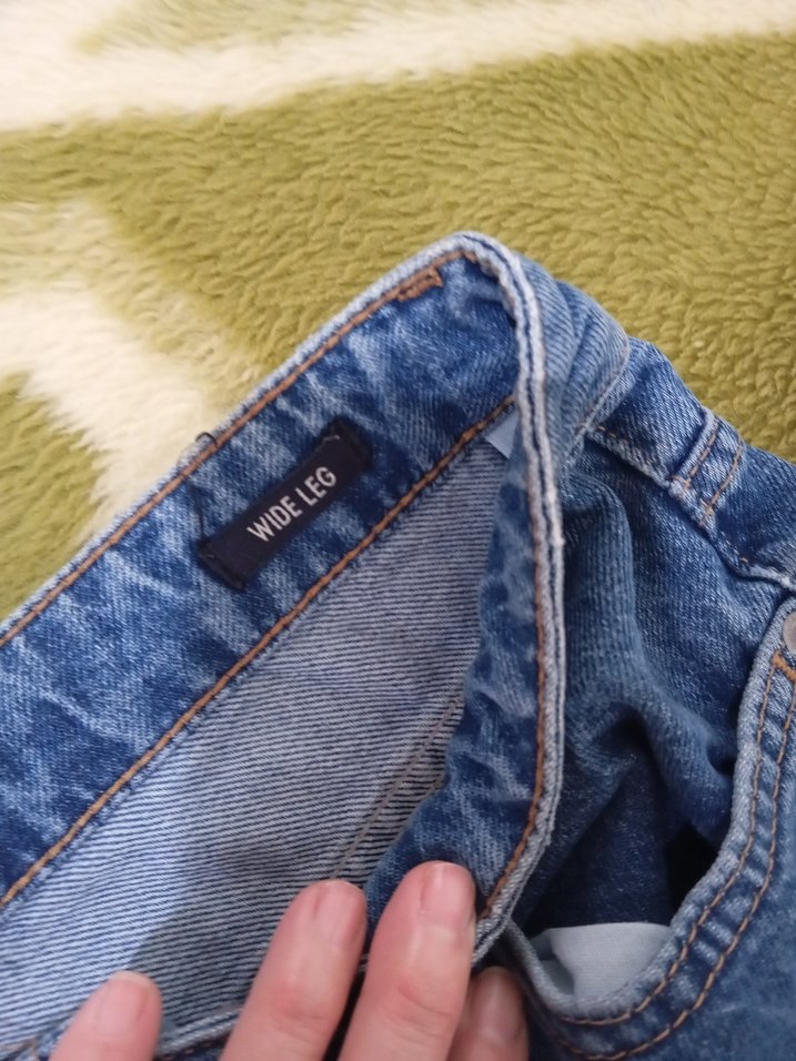 Geniş paça, düğmeli mavi kot pantolon. Normal boy, rahat kesim, günlük sokak stili için uygun. Desensiz tasarım.