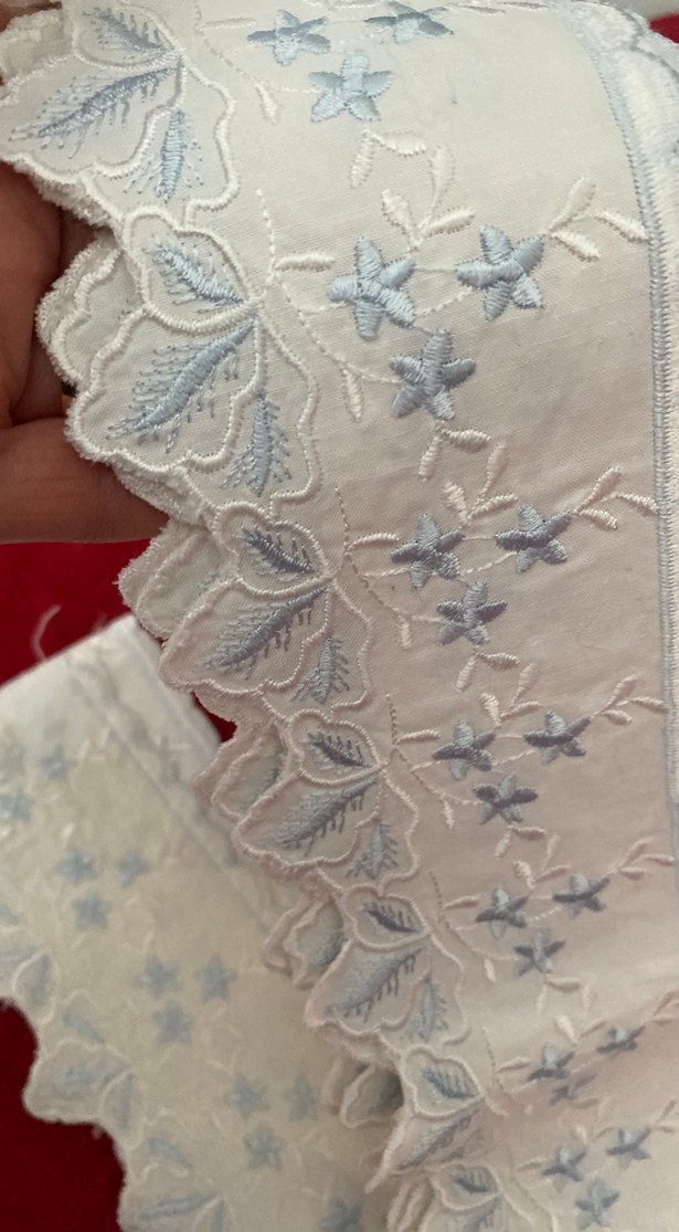 Pamuk Fisto 7 cm eninde 4,72 cm boyunda. Arkası telalı. Son fotoğrafta arkası görülebilir. Mavi nakışlı. Tok duruşu var.