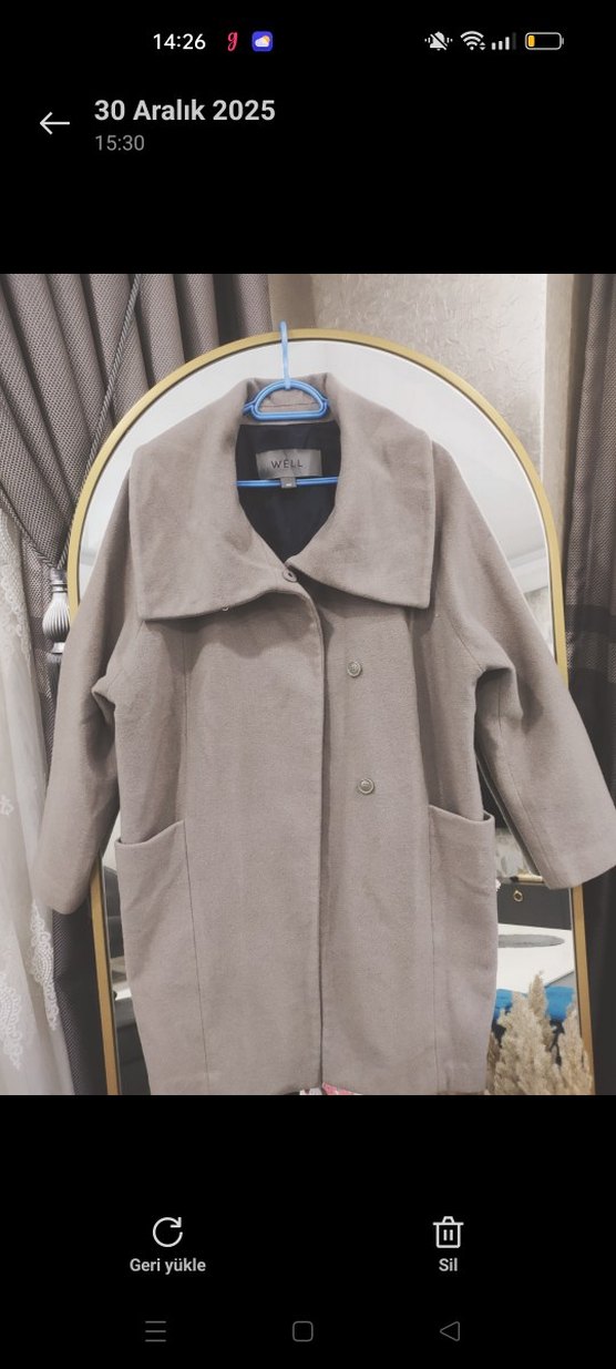Geniş yakalı, ön cepli bej kaban. Yumuşak dokulu kumaştan, düğmeli ve rahat kesimlidir.