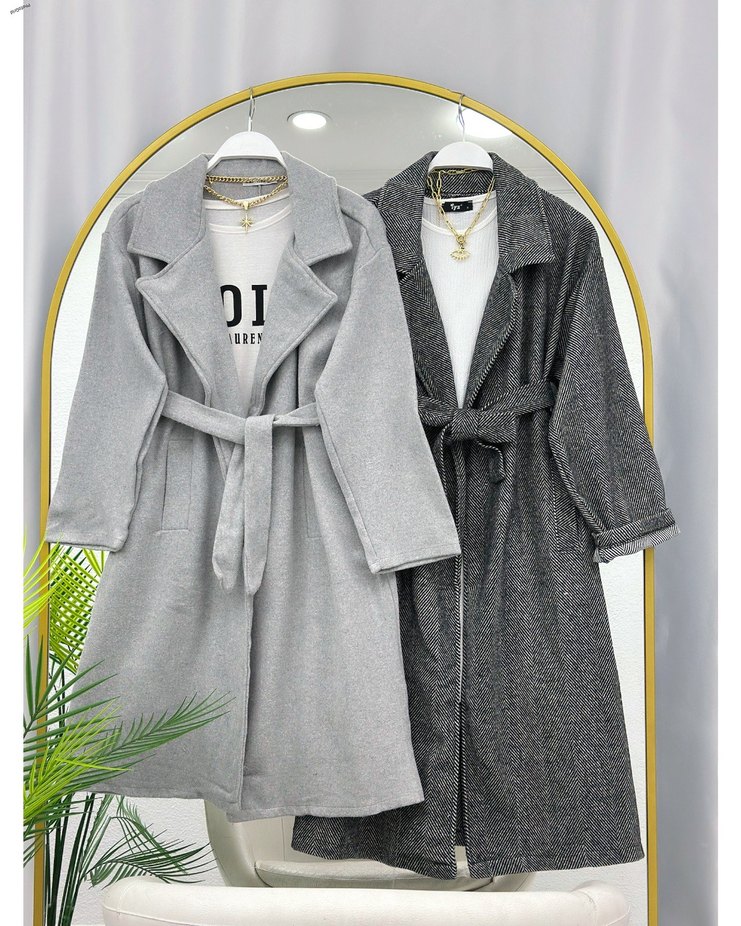 Açık ve koyu gri tonlarda, geniş yakalı ve kuşaklı uzun kabanlar, rahat ve şık bir görünüm sunar. [Beyaz olanı satıyorum teklı almak isteyen yazmadan almasın bedeni 36 ___44 kadar var dır suan ındırımlıdır r:: astarsız cepli kuşaklı 100 cm yaklaşık boyu DOKUMA BALIKSIRTI KAŞE ]