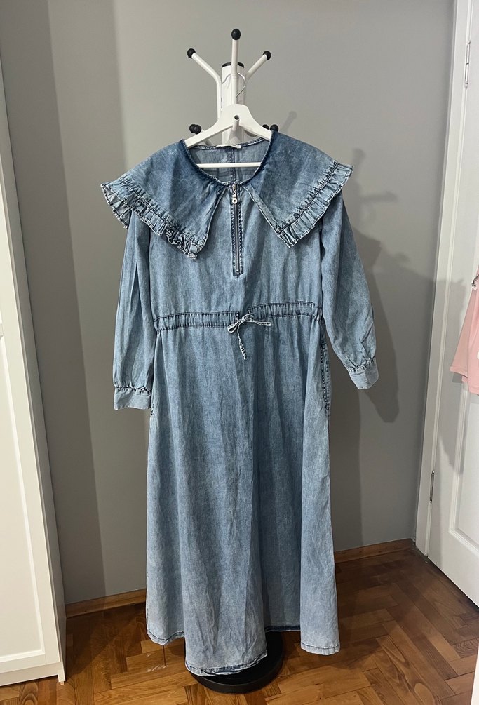 Geniş fırfırlı yakası ve bağcıklı beliyle bol kesim uzun denim elbise. Uzun kollu, rahat ve vintage tarzda günlük kullanıma uygun. Faya boutique den aldım bir kere giydim ama yıkanınca rengi değişen bir kumaş. Bir kere yıkadım. Bedeni standart göğüs ölçüsü 48 boy 132 belki de gerilmemiş hali yaklaşık 53cm