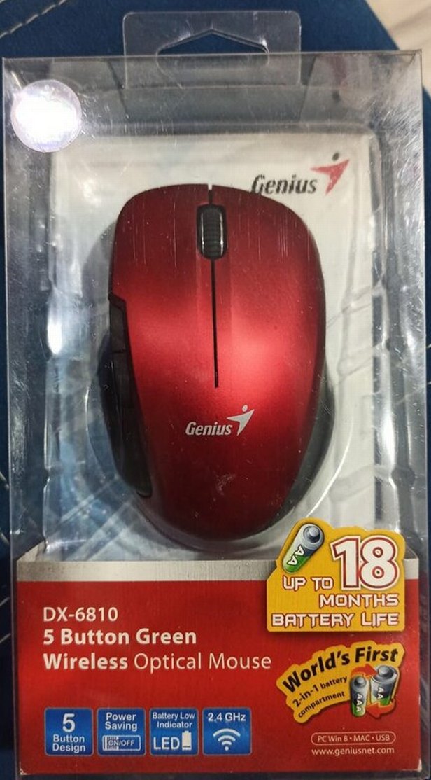 Genius DX-6810 kırmızı kablosuz optik fare, 5 tuşlu ve 18 aya kadar pil ömrü sunar. Canlı tasarımla güvenilir performans sağlar. ️sıfır kullanılmamış kutulu