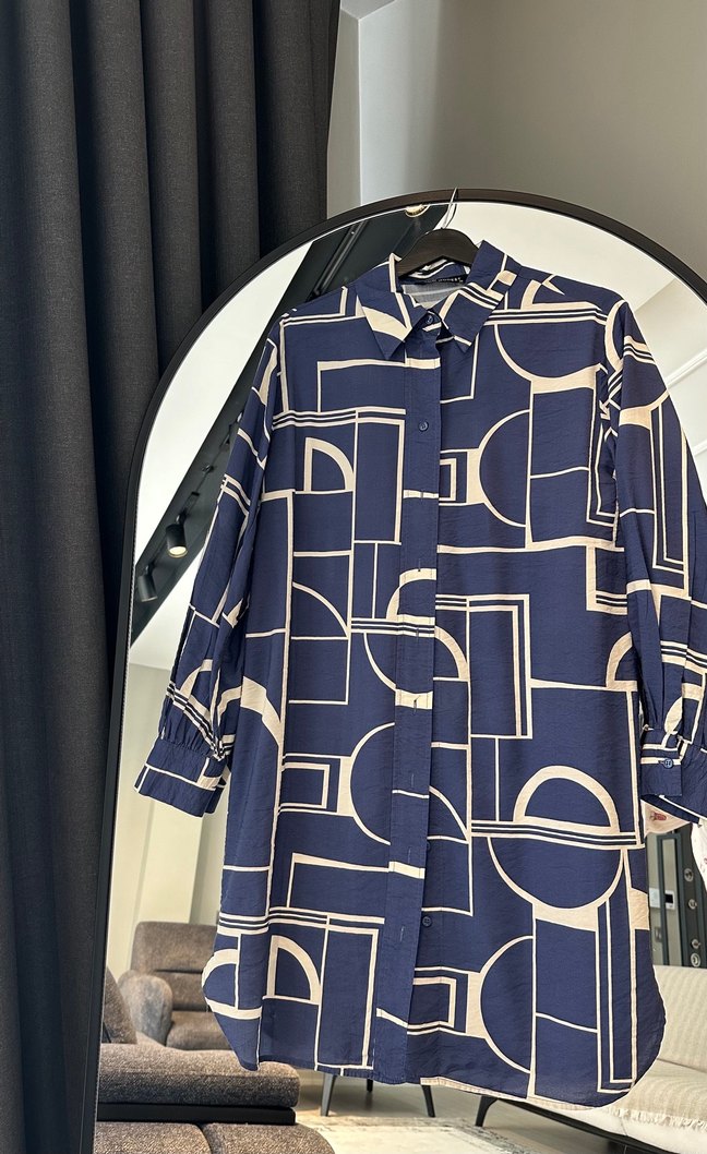 Geometrik desenli, uzun kollu, düğmeli, yakalı ve bol kesim mavi gömleği, sentetik kumaştan günlük kullanıma uygundur . Temiz kullanılmıştır