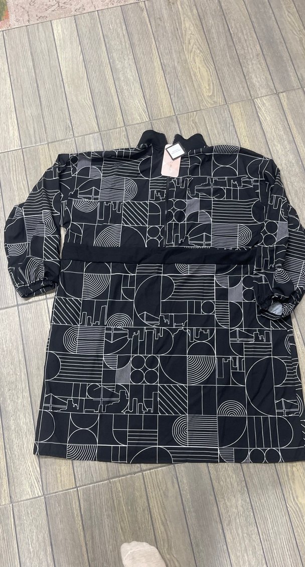 Siyah renkli, geometrik desenli haşema, bol kesim, uzun kollu ve yüksek yakalıdır. Düğmeli kapanışıyla sokak stiline uygundur. Etiketli ürün. İki koltuk altı arası 61-62 cm, üst boy 90 cm, basen 53 ama esnek kumaş, 97-98 cm Ürün oversize gibi olduğu için 46-48 bedene daha güzel oluyor