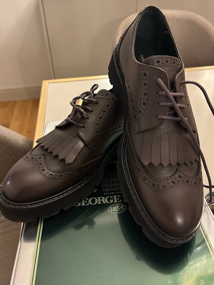 Koyu kahverengi deri klasik ayakkabı, püsküllü ve baskılı detaylı, ofis kullanımı için uygun. Brogue desenli ve marka iç tabanlı.