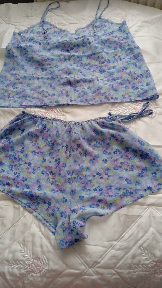 Mavi pastel çiçek desenli, askısız üst ve şortlu, bol kesim kadın pijama takımı. Rahat ve hafif yapısıyla konfor sağlar. beybidoll George marka İngiltere'den alındı 2 kere giyildi