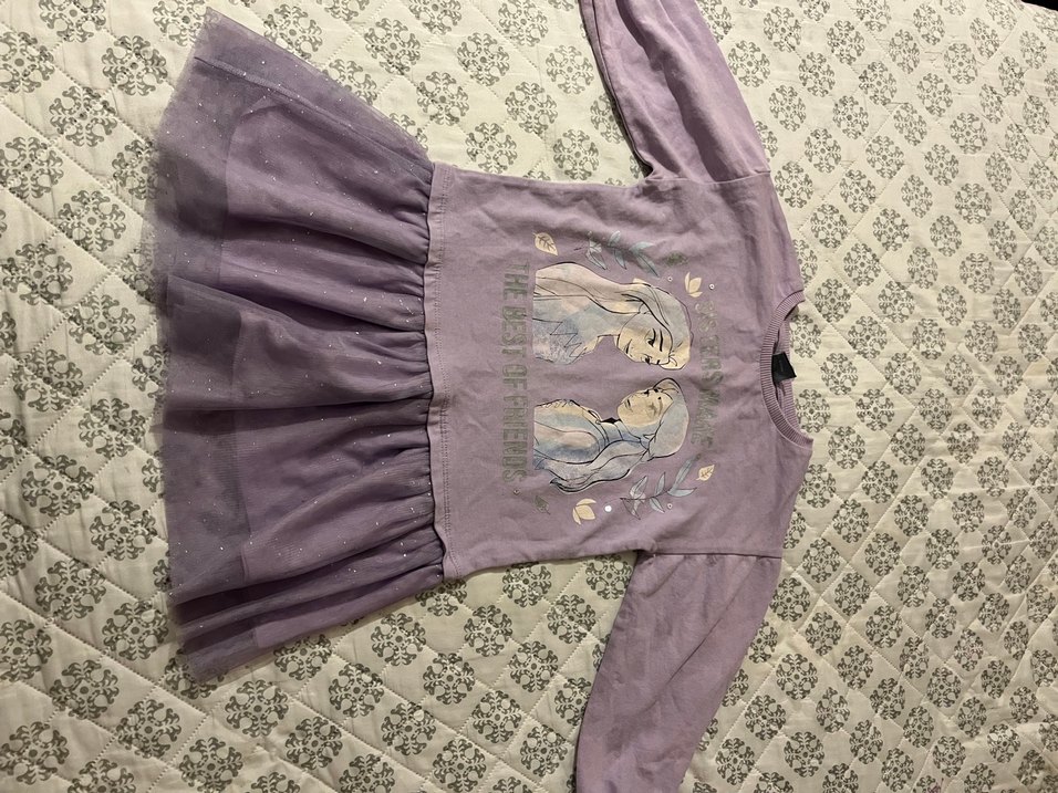 Mor uzun kollu, bol kesim kız elbisesi, yuvarlak yakalı ve baskılıdır. Fırfır detaylarıyla bohem esintili, pastel sokak stili sunar.