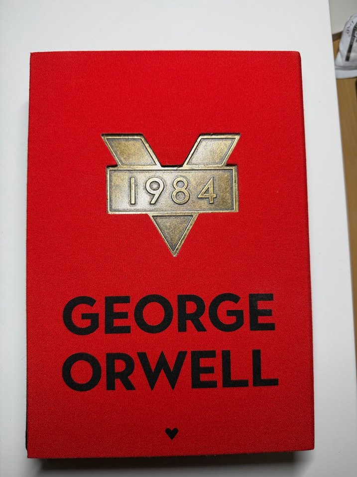 George Orwell'un 1984 adlı klasik romanı, metalik amblemli kırmızı kapakla.